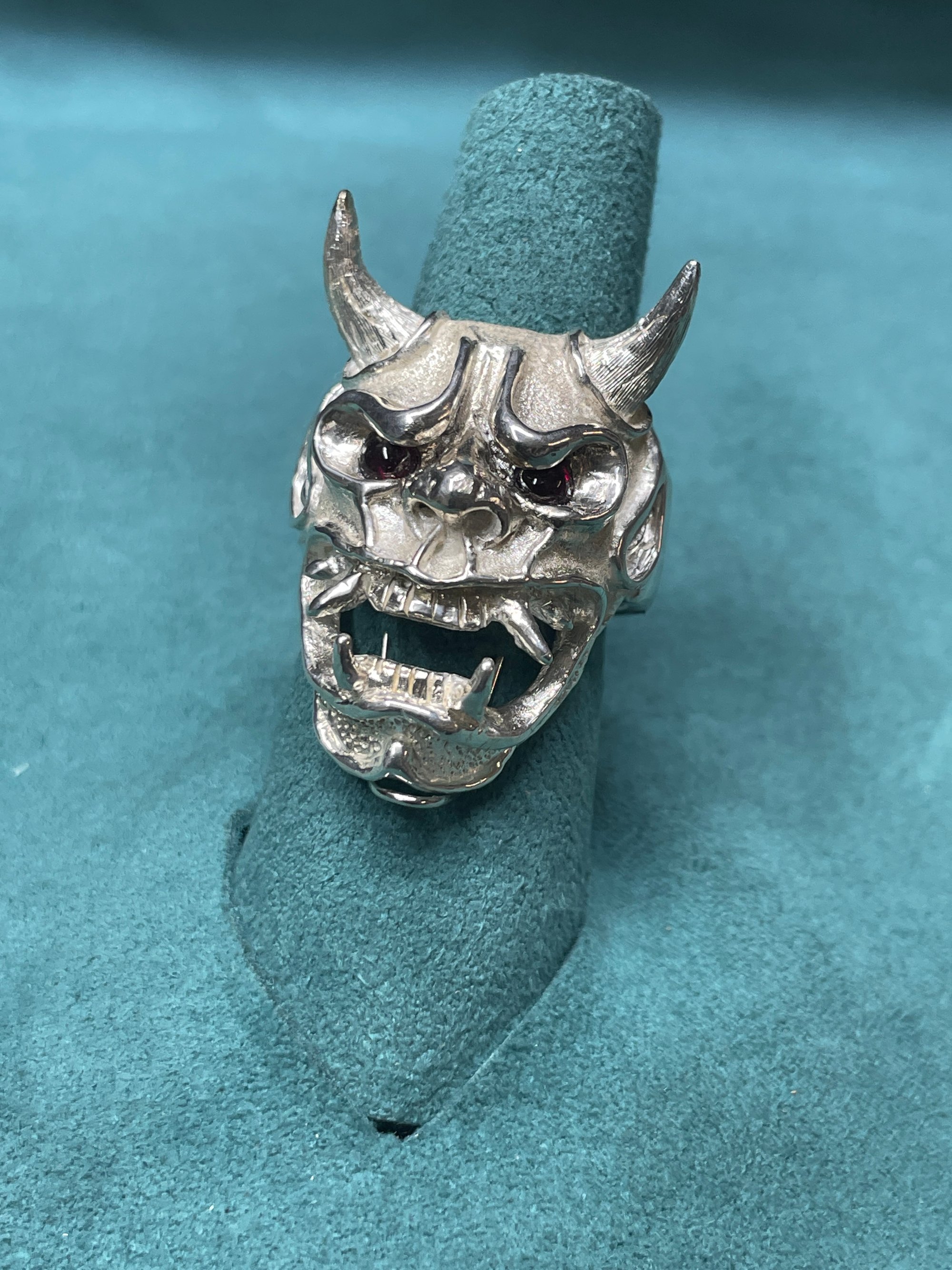 Hand made Sterling Silver Japanese Hannya Mask Ring with Lab Rubies.